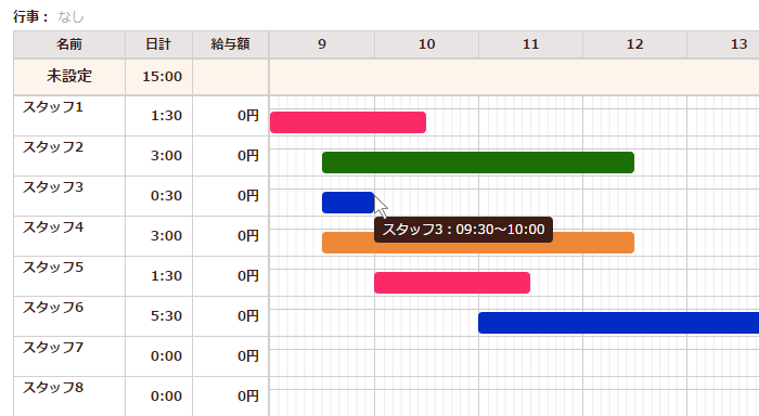 You can easily perform shift input as if you were handwriting just by dragging the mouse. You can also register break times in the same way, and if you set a work pattern in advance, you can easily create shifts by simply entering the pattern from the next time. A sudden shift addition or time change can be handled by simply moving the mouse left or right.