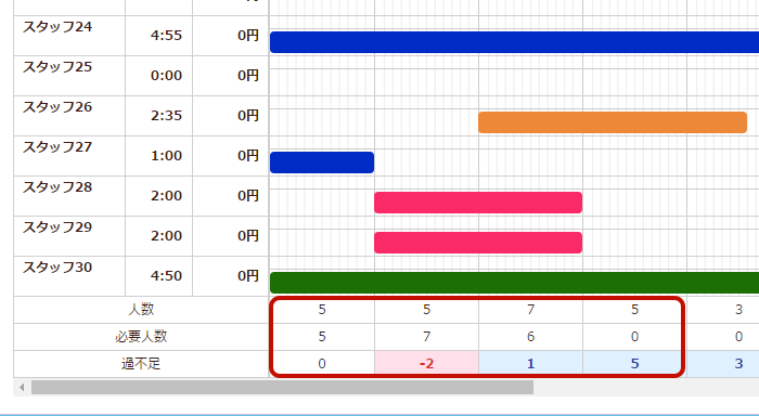 The number of staff for each hour is automatically displayed on the screen, so you can check the excess or deficiency at a glance by setting the required number of staff.