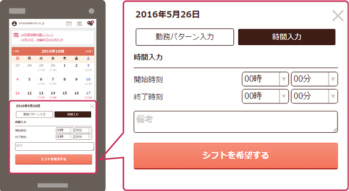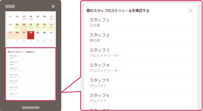 Since staff can check the shifts of other staff, the staff themselves can search for replacement personnel for sudden vacancies. Also, by using the staff screen, the manager can check the shift status even when out of the office.