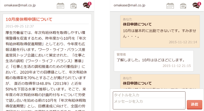 There is no need to prepare your own contact method by using the "bulletin board" and "message function" provided by Omakase Shift for business communication, announcements, and communication from staff.