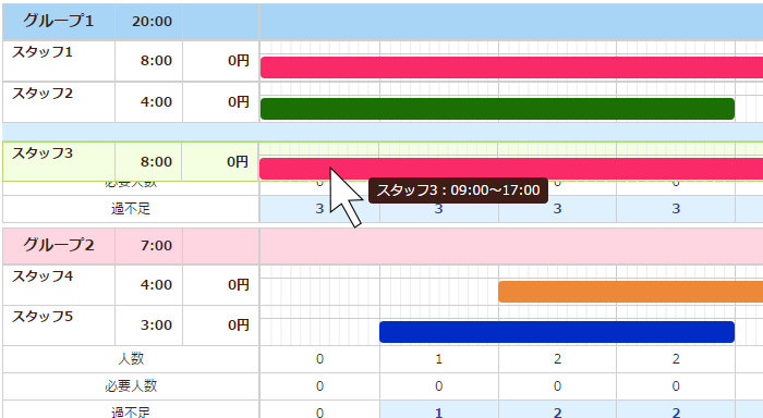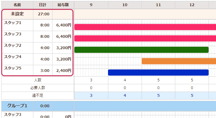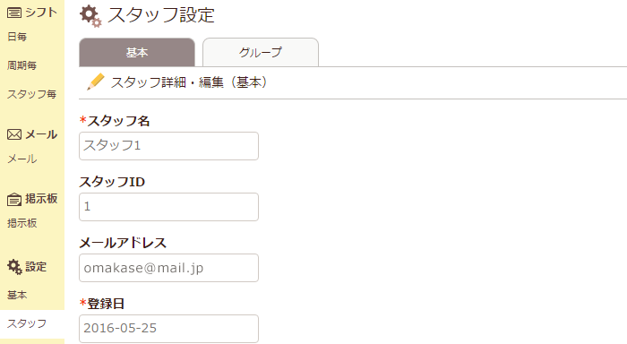 Staff can be grouped by department or task, so the management screen is easy to see, and you can register them all at once when creating shifts.