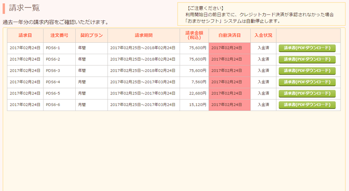 ご契約後は、弊社からの請求書、お支払い状況を確認することができます。(請求書は pdf 形式で出力されます。)